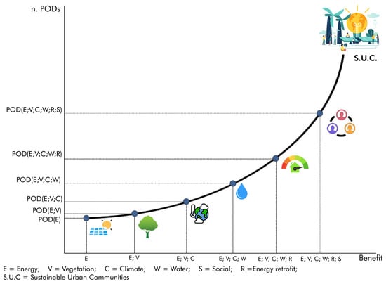 Once the number of PODs has been derived as a function of bill savings or costs, the second step is to verify the community size as a function of energy efficiency, using the indicators of Cielo et al. []: