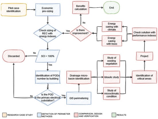 The process proposed by the research group involved cyclic repetition of the analysis, design, and verification phases to identify the best multi-purpose solutions. Pre-dimensioning is carried out by using a balance equation between the self-consumption of the school building and the perimeter of the community, considering the installed power. The proposed model integrates morphological-urban evaluations through thematic maps and the interactive worksheet.