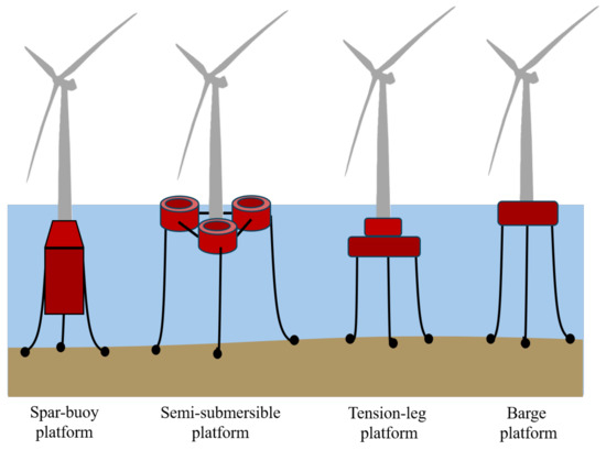 The overall FOWT system, illustrated in Figure 1, is composed of a wind turbine to harvest energy from the wind, which is installed on a floating platform attached to the seabed by mooring lines, thereby ensuring support to the wind turbine and the platform. The wind turbine can be classified into two main types: horizontal axis wind turbines (HAWTs) and vertical axis wind turbines. This paper focuses on HAWT systems, given their widespread adoption. The turbine consists typically of a rotor, three blades, a tower, a nacelle housing a low-speed shaft (LSS) and a high-speed shaft (HSS) connected through a gearbox, and a generator. The design of the floating platform is inspired by technologies from the oil and gas platform sector, with the main technologies available being barge, spar–buoy, tension leg, and semi-submersible [4], as illustrated in Figure 2. The barge platform achieves stability through a waterplane area, while the spar–buoy platform is stabilized by a ballast with a lower center of mass. The tension leg platform (TLP) employs tension mooring lines fixed to the seabed for stabilization. The semi-submersible platform combines features of both barge and spar–buoy technologies and is stabilized by a combination of ballast and waterplane area. In all these platform structures, a mooring system is employed to maintain the platform at a specific position and thus prevent drift displacement.