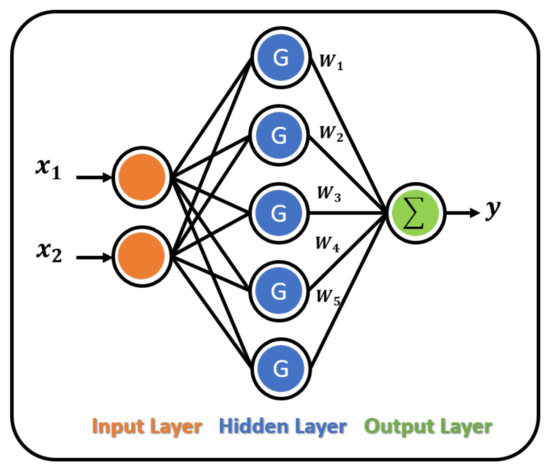 Within the domain of machine learning methods, the family of deep learning methods, particularly ANNs, holds significant promise for advancing the control of FOWTs. Two prominent types of feedforward neural networks in this context are the multi-layer perceptron (MLP) and radial basis function (RBF) neural network. These networks typically comprise three layers: the input layer, the hidden layer, and the output layer. Neurons in the input layer generally have a linear activation function, while non-linear activation functions such as sigmoid, logarithmic, and hyperbolic tangent functions are employed in the hidden and output layers for MLP. Conversely, RBF networks utilize a Gaussian activation function for their hidden layer. An illustrative architectural scheme for an RBF network with a single hidden layer is presented in Figure 7.