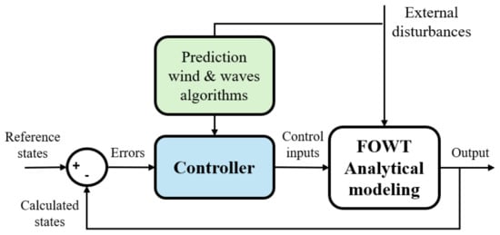 MPC is an advanced control methodology that optimizes the future behavior of a system within a defined time interval, known as the prediction horizon, by leveraging input variables. Unlike traditional control strategies, MPC actions are not solely determined by the errors between the output and the setpoint. Instead, MPC bases its decisions on the control input and the system’s response to that input. While commonly applied in the context of bottom-fixed wind turbines, this strategy demonstrates great performance outcomes when applied to FOWTs. An MPC-based CPB controller, designed based on a linear model with the goal of maintaining power at its rated value and minimizing structural loads, was implemented for a 10 MW FOWT [42]. This strategy exhibited superior performance compared to a PI controller, especially in terms of power regulation, platform pitch reduction, and successful tower fatigue reduction. In [43], a linear MPC was designed for a 10 MW FOWT. The proposed controller was tested on a simplified linear model and demonstrated a reduction in tower bending and platform pitch motion with less power variation compared to [14].