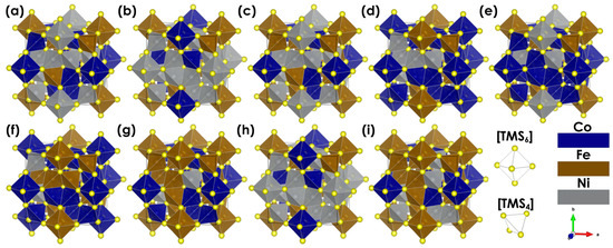 The pentlandite structure is characterized by cubic symmetry with a highly metallic framework. As noted by Lu et al., the structure can be further divided into substructures, ensuring a highly conductive backbone coupled with the presence of numerous bimetallic and Me-S active sites [21]. To showcase the effect of different cationic site occupations, 2 × 2 × 2 supercells were used (Figure 2). The metal atoms occupy either tetrahedral or octahedral sites that are related to 24e and 8c Wyckoff positions, respectively. The arrangement of atoms is semi-random, ensuring that at least two atoms of each metal are present in every site. Due to the nature of the work, we only consider intrinsic, not surface, properties.