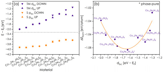 The density of states plots of the pentlandites (Figure S6) confirm that all the materials were metallic in nature, with strongly overlapping valence and conductive states [21]. Additionally, two main observations can be made. Except for “611” (Figure S6e), the states near the Fermi level were highly and uniformly populated, facilitating rapid charge transfer between the electroactive species and the electrode surface with increasing overpotential values. Moreover, disparities between the up- and down-spin densities were observed, with the latter being shifted to higher energies with respect to the Fermi level. This effect was particularly prominent for compositions with a higher Fe content, suggesting possible ferromagnetic characteristics. The electronic structure descriptors are presented in Figure 3a. Both dbc as well as pbc represent linear functions of the chemical compositions. However, the changes in the former are more pronounced than in the latter. As these parameters were derived from the TM and S PDOS, they inherited their main characteristics. Specifically, discrepancies between different electron spin polarizations for Fe-rich materials remained visible. The calculations indicated that Fe and Ni cause antagonistic effects on the electronic structure, with Fe/Ni shifting the dbc towards/away from the Fermi level and Co-rich compositions being characterized by intermediate values of these descriptors. Based on the literature evidence for chalcogenide systems, the upwards shift towards the Fermi level should be beneficial in terms of electrocatalytic performance [21,41,42]. Despite such premises, no straightforward relationship between the electronic structure descriptors and electrocatalytic performance was observed (Figure S7). This highlights the crucial role of anions present in the structures [15]. The sulfur activation process occurring in these materials masks the effect that electronic structure has on electrocatalytic activity, and thus simple concepts such as TMs band centers in pristine bulk structures are unable to properly predict the materials’ performance. A more insightful use of the DFT should include the surface energetics and vacancy formations along the surface density of states calculations.