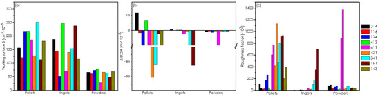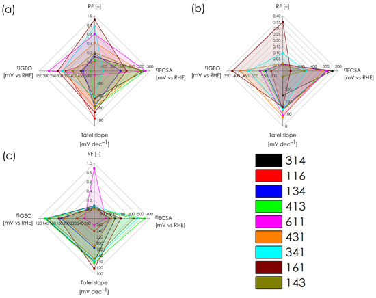 General relationship between the chemical composition, RF, ƞECSA, ƞGEO, and Tafel slopes for (a) pellets; (b) ingots; and (c) powders.