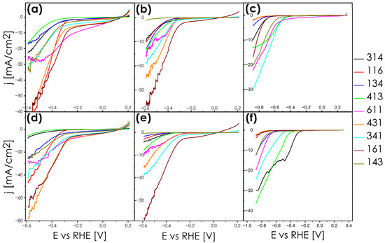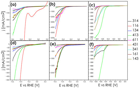 LSV curves recorded in 0.5 M H2SO4 at 6.25 [mV/s] weep rate and normalized to geometrical surface for (a) pellets before chronoamperometry; (b) ingots before chronoamperometry; (c) powders before chronoamperometry; (d) pellets after potentiometry; (e) ingots after chronoamperometry; (f) and powders after chronoamperometry.