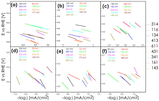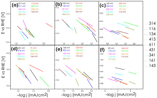 Tafel slope recorded in 0.5 M H2SO4 at 6.25 [mV/s] sweep rate and normalized to ECSA for (a) pellets before chronoamperometry; (b) ingots before chronoamperometry; (c) powders before chronoamperometry; (d) pellets after chronoamperometry; (e) ingots after chronoamperometry; and (f) powders after chronoamperometry.
