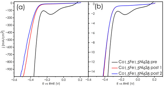 Materials with a nominal composition of Co1.5Fe1.5Ni6S8 constitute a very interesting case. Materials that already exhibit multi-phase composition after synthesis undergo further phase decomposition due to thermal treatment during the sintering process. In the cases described above, these foreign phase precipitations are typically catalytically active, creating the random yet favorable scenario of a catalyst anchored to another catalyst. In the case of sintered pellets, the highly conductive substrates are composed of strongly consolidated pentlandites. Although such composite systems often yield low overpotentials, as demonstrated, they can slow down the kinetics of the HER reaction. The initial stages of the Pe116 sample are no different, wherein the amount of nickel sulfide increases from about 4% after synthesis to about 12% upon sintering. These actively segregated nickel sulfide phases translate into very good HER efficiency, as depicted in Figure 10, both as a function of ECSA (Figure 10a) and of geometric surface area (Figure 10b), reaching η100 = 244 [mV] and η10 = 341 [mV] respectively. Additionally, a characteristic bend in the LSV curve associated with the reaction of NiS itself can be observed. Due to its unusual behavior, this material underwent additional processing according to the following scheme: surface cleaning 1 → ECSA 1 → HER 1 → chronoamperometry 1 → surface cleaning 2 → ECSA 2 → HER 2 → chronoamperometry 2 → surface cleaning 3 → ECSA 3 → HER 3. After the first chronoamperometry measurement, the properties of this material significantly deteriorated, resulting in overpotentials at the level of η100 = 327 and η10 = 388 [mV] as a function of ECSA and geometric area, respectively. However, subsequent chronoamperometry and LSV measurements caused practically no change to the catalytic performance of this material. The structural analysis (Figure 11) reveals that during operating conditions, the nickel sulfide (Figure 11a) contamination disappears (Figure 11b) and the remaining Ni-rich pentlandite becomes a single-phased system. In other words, there is no further decomposition of the system, and a thermodynamic equilibrium state is established, indicating the limit of nickel solubility in this system to be specifically near the Co1.42Fe1.37Ni5.21S8 composition (based on SEM-EDX). This is especially well observed in Figure 11c, where the areas affected and unaffected by the HER processing are presented.