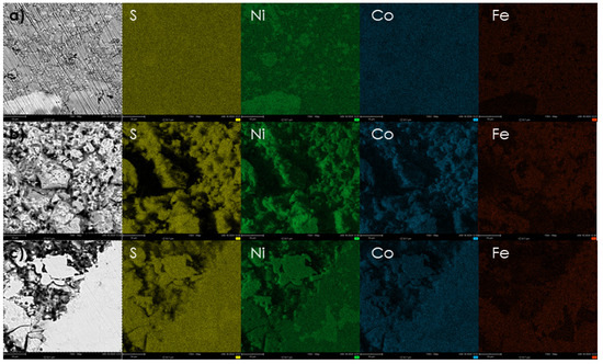 The desired elements were weighed into self-prepared quartz ampoules in the form of powders (Co—99.8% Alpha Aesar, Haverhill, MA, USA); Ni—99.8% Alpha Aesar) and granules (Fe—99.98% Alpha Aesar; S—99.999%) and sealed under quasi-vacuum conditions (10−3 [atm]). The samples were then pre-homogenized and synthesized in a tube furnace in a two-stage heat treatment process. The first stage consisted of heating the samples (heating rate: 1 [°Cmin−1]) to 1050 [°C] and annealing at this temperature for 24 h. The second stage included cooling the samples to 500 [°C] and annealing at this temperature for 72 h, which was followed by quenching in tap water at room temperature.