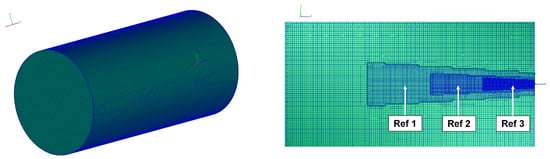 The RANS simulations of this study were conducted on a fixed mesh with a base cell size of 1 mm. Three refinement steps in the near-nozzle area resulted in a minimum cell edge length of 125 m. Figure 2 visualizes the spray-box mesh with its refinement areas and a cell count of 966,000.