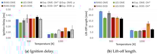 Figure 3 compares the results for LES, RANS, and experiments for high-temperature ignition delay (ID) and flame lift-off length (LOL) for both operating points. It can be seen that the simulations reproduce the experimental data well in general. However, the LES seems to overestimate the lift-off for n-dodecane in the case of 1200 K ambient temperature and slightly underestimate the lift-off length for OME for 900 K ambient temperature. Remarkably, LES and RANS predict an identical ignition delay for n-dodecane in the case of 900 K ambient temperature, namely 340 s, which is valuable for being able to compare the transition from the cool-flame to high-temperature combustion for both turbulence modeling approaches.