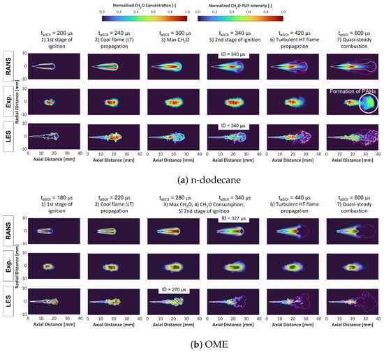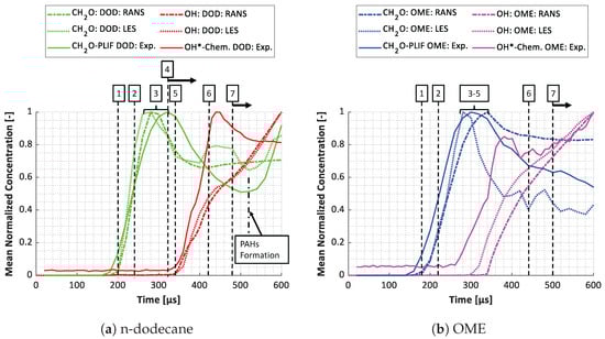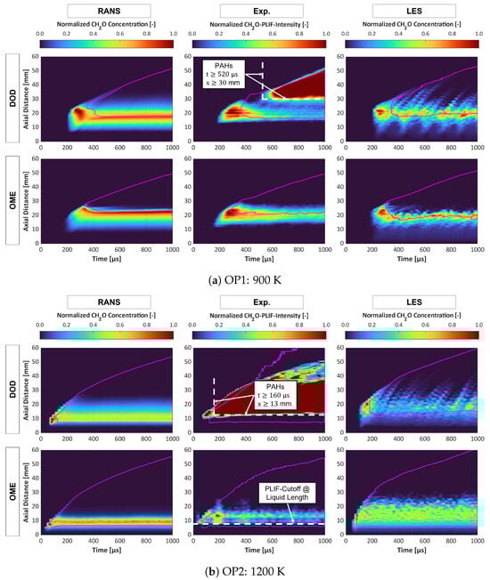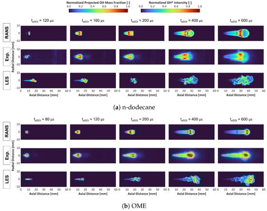 The comparison between the two fuels for OP1 (900 K) in Figure 5 demonstrates significant differences in the spatial distribution of the high-temperature reaction zone, already observed in [17,18]. For n-dodecane (Figure 5a), the highest intensity is measured and simulated in the shear layer of spray and ambient air, which are also the locations of the first ignition kernels. As the flame propagates downstream, the high-intensity region stretches with it along the length of the spray. For OME (Figure 5b), the kernel of the ignition is at the tip of the spray in the center of the symmetry plane. The fuel-rich center of the spray remains the high-intensity region for the entire high-temperature combustion. Both simulations differ from the experiments in that the simulated peak of the OH species concentration travels with the flame downstream of the lift-off length. The experimentally observed peak of the excited OH* radical maintains its position near the flame lift-off length. The overall contour is well represented by both simulations, with the LES being able to reproduce the high intensity in the spray center better than the RANS calculations.