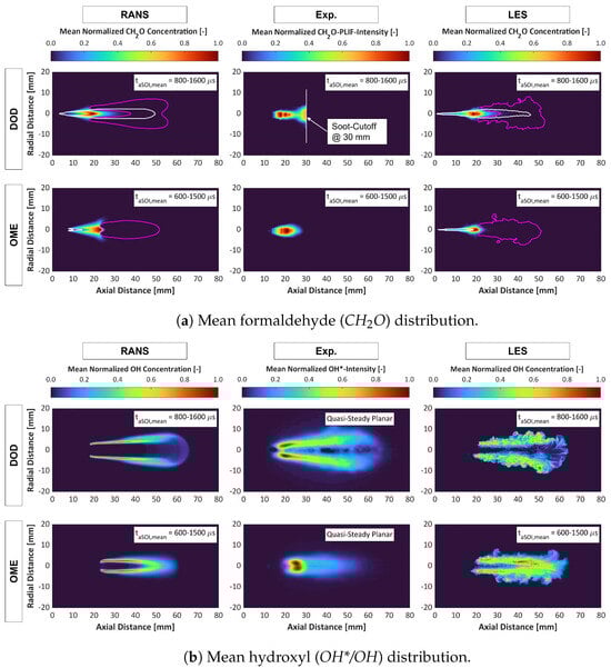 When observing the high-temperature combustion, Figure 7b, the center region into which the n-dodecane-rich mixture () penetrates is characterized by low OH* intensity for the experiment and even lower OH concentration for the simulations. The lean OME spray, with its separated cool and hot flame, shows a very different flame morphology in the spray center plane. In the experiments especially, the OH* intensity peaks only a few millimeters downstream of the lift-off length and remains elevated at the spray axis. Neither simulation can fully reproduce the stark contrast to n-dodecane in the high-temperature flame morphology. Notably, the simulations do not show the high-intensity blob shortly after the flame lift-off. The LES seems to be more capable in that regard, as it yields a higher OH concentration along the spray axis compared to RANS calculations.