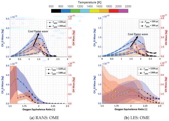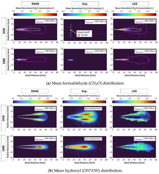 The peak in PLIF intensity and simulated CHO concentration can be located at approximately 20 mm in the center of the spray for both fuels. OME tends to concentrate its CHO formation a few millimeters further downstream. For the simulations, the zone of high-temperature combustion is shown with magenta iso-lines indicating a temperature of 1600 K, which, according to Idicheria and Pickett [46], serves as the best reference for marking the threshold of the destruction of CHO and the regime of high-temperature (OH*) reactions. This observation is confirmed when analyzing Figure 7a, and later on in Figure 13 within Section 3.2, as for both fuels no significant amount of CHO enters the high-temperature zone. Additionally, fuel-rich regions in Figure 7 satisfying the criterion of are shown with white iso-lines. Hereby, the equivalence ratio () is defined as a passive scalar independent of the reaction state. For oxygenated fuels, such as OME, this definition has to be adapted by the chemically bound oxygen within the fuel structure following the conclusions of Mueller [47]. The existence of chemically bound oxygen causes the traditional definition of the equivalence ratio () to incorrectly calculate the distance of a reactant mixture from its stoichiometric condition. Hence, the appropriate passive scalar mixing parameter for oxygenated fuels is the oxygen equivalence ratio ().
