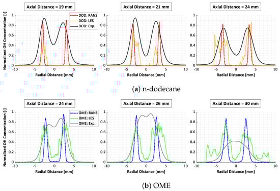 The radial profiles for OME at 1200 K, Figure 10b, show a distinct difference from their 900 K counterparts. A few millimeters downstream of the lift-off length, the typical peak OH* intensity in the spray center axis is measured. However, further downstream at mm, a drop in intensity in the spray center is visible, producing a similar radial profile shape compared to n-dodecane, with higher relative values for OH* intensity. At the flame tip, the intensity peaks again at the center, which the simulations can partly capture, showing elevated OH concentrations on the spray center axis at mm downstream of the nozzle.