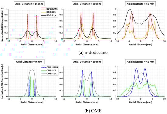 This behavior is even more pronounced for OME, where the respective experimentally observed peak intensity is right in the center axis of the spray. The RANS simulations again show sharp concentration peaks roughly one millimeter closer to the center axis than the respective RANS n-dodecane calculation. The LES shows slightly more evenly distributed profiles, which have an elevated OH concentration in the center, albeit not enough to align with the experiments.