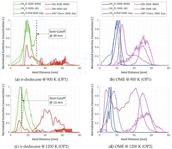 The following analysis aims at depicting the spatial transition of cool (CHO) to hot flame OH*/OH for the two studied ambient temperatures and fuels with Figure 11, where the transition from cool- to high-temperature flame along the spray centerline is depicted for the time-averaged results of the measurements and simulations.