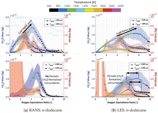 The results for the mean cool-flame shape are displayed in Figure 8a. As is indicated in the plots of Figure 4b, the PLIF measurements for n-dodecane are impaired by the presence of PAHs, which are entirely absent for OME. The soot cutoff axial position shown in Figure 8a virtually denies an adequate assessment of the time-averaged cool-flame distribution for n-dodecane. When comparing RANS and LES at 1200 K for n-dodecane, it is noticeable that the LES predicts an CHO distribution that penetrates further into the combustion chamber compared to RANS, which also pushes the high-temperature zone (magenta iso-line) further downstream. The same observation is made for OME. Here, because of the absence of PAH concentration, it is discernable that the RANS calculation delivers results closer to predicting the measurements.