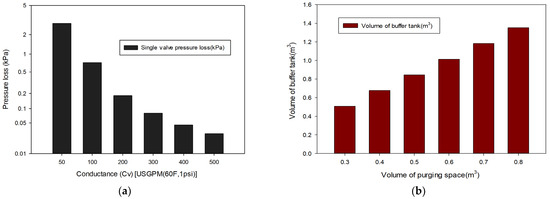 (a) Pressure change according to change; (b) volume of buffer tank in relation to volume of purging space.