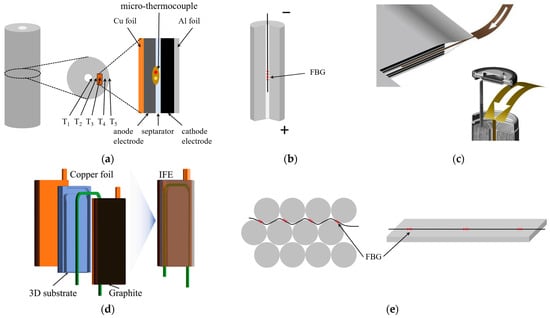 Micro-thermocouples, Fiber Bragg Grating (FBG), film thermistors, and the Resistance Temperature Detector (RTD) are typical sensors for temperature sensing inside cells due to their small size, which are usually implanted in the middle layer of a prismatic or pouch cell or in the cavity of a cylindrical cell [,,,,]. The working principle of a thermocouple is based on the thermoelectric effect of metal, and its terminal voltage can reflect the temperature. The working principle of FBG is based on the thermal expansion and contraction effect of the grating spacing. The FBG peak position can reflect the temperature but the grating spacing is also affected by stress. Therefore, FBG temperature measurement needs to decouple the temperature–stress effects. The temperature measurement principle of thermistors and RTDs is based on the resistance–temperature effect of the material, and its resistance reflects the temperature. Zhang et al. [] arranged multiple micro-thermocouples in the axial center plane of an 18650 cell along the radial direction of the cell (Figure 3a), and then obtained the radial temperature distribution during the charging and discharging of the cell. The results showed that a higher rate and lower ambient temperature led to higher internal temperature of the cell and a larger temperature gradient. Increasing the convective heat transfer coefficient can reduce the battery temperature rise but the internal temperature gradient becomes larger, so treating the battery as an isothermal body under forced convection conditions will bring a large error. Huang et al. [] placed FBGs into the central hole of an 18650 cell to measure the internal and surface temperatures simultaneously (Figure 3b). Joe et al. [] placed film thermistors into the internal core of an 18650 cell and in the middle position of the thickness direction of a pouch cell (between the negative electrode and the separator), respectively (Figure 3c). Through cycling tests and post-mortem analysis, it was found that the implantation of thermistors could potentially result in capacity loss and increase the risk of lithium plating. Additionally, it could lead to uneven pressure and mechanical damage when assembling single cells to a module or pack. Removing a portion of electrode materials to leave space for internal thermistors could alleviate the uneven pressure caused by sensor implantation [] but it would reduce the cell energy density and increase the complexity for real-world application. Wang et al. [] designed an integrated functional electrode (IFE), which consists of two single-layer coating electrodes covering a fiber sensor integrated on a substrate (Figure 3d). The substrate ensures that the stacking stress between the electrodes does not squeeze the fiber sensor during cycling, allowing distributed measurement of the temperature inside the cell. Through comparative analysis of electrochemical parameters, disassembly characterization, and non-destructive in situ testing, it has been proven that the design of this IFE can achieve in situ measurement of internal temperature without affecting the electrochemical performance of the cell.