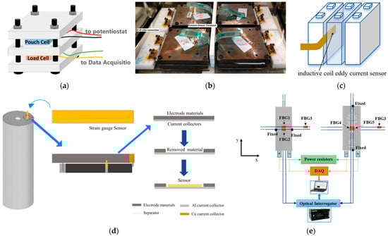 Sensing of mechanical signals: (a) mechanics-sensing device based on LVDT []; (b) pressure distribution measured by a thin film strain resistance sensor (reproduced with permission from Barai et al. Journal of Energy Storage; published by Elsevier, 2017) []; (c) inductive coil eddy current sensor to measure cell thickness variation; (d) miniature thin-film strain sensor implanted with 18650 cell(reproduced with permission from Zhu et al. Journal of Power Sources; published by Elsevier, 2021) []; (e) adhering two different types of FBG sensors on the x and y directions of the battery surface [].