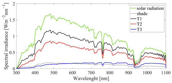 Three polyethylene sheets with different transmittances were used to create different shading levels, denoted as T1–T3, with T1 having the highest transmittance. The spectrum of the shading sheets was measured using an EKO MS-711 spectroradiometer from EKO Instruments, Co., Ltd., Tokyo, Japan [31], covering a 300–1100 nm region. The measured spectra are shown in Figure 1 along with a spectrum of the “regular” shade. Then, by comparison with the spectrum measured without shading the spectroradiometer, the spectrally weighted transmittance of each sheet was calculated. The resulting transmittance values for sheets T1–T3 were 61%, 36%, and 14%, respectively. These values represent the percentage of solar radiation that passes through a sheet in the considered wavelength region. Transmittances T1 and T2 were practically independent of the wavelength, as is the case for the regular shade, while transmittance T3 increased nearly linearly with the wavelength. However, near the edge of the recorded spectrum, the sensitivity of the silicon solar cells was significantly reduced [32], so this effect can be neglected without affecting the results of the study. Therefore, sheet T3 was used to represent a “regular” shade. Despite some differences in the spectrum, this is a much more realistic scenario than using completely non-transparent material, an approach commonly found in the literature.