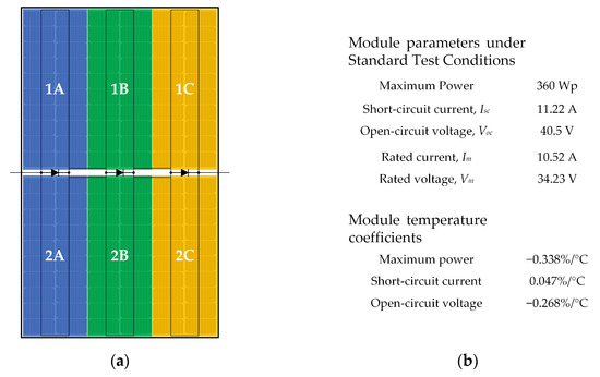 A half-cut PV module SV120-360 E BC HC9B [33] from Croatian manufacturer Solvis d.o.o., Varaždin, Croatia, was used for the experiment. This module consists of 120 monocrystalline solar cells, each with a size of 166 mm × 83 mm. The module is split into two halves connected in parallel, with each half comprising 3 substrings of 20 solar cells in series. Just like in the case of full-cell PV modules, there are three bypass diodes, every diode connected in parallel to the series string of 20 solar cells. In the case of half-cut PV modules, individual bypass diode is therefore shared by the two substrings from the opposing halves of the PV module. Overall, the half-cut PV module can be considered to comprise six substrings of 20 solar cells in series. The internal structure of the module is illustrated in Figure 2a. For easier understanding, each 20-cell substring is labeled using numbers 1 and 2 to designate the upper (1) and lower (2) half of the module, and letters A, B, and C designate the bypass diode that is connected to the considered substring. Additionally, the main parameters of the PV module are given in Figure 2b.