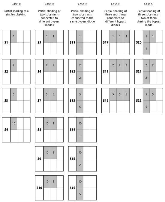 Considered cases of shading scenarios, denoted S1–S22 in the figure. Shaded blocks indicate the position of the shaded substrings and numbers on the shaded blocks indicate the number of shaded cells in the corresponding substring. For every scenario, all three shading levels corresponding to sheets having transmittances T1–T3 are examined.