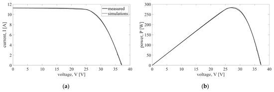 Comparison of simulations and measurements for the case of an unshaded PV module (referent scenario S0): (a) I-V curve; (b) P-V curve.