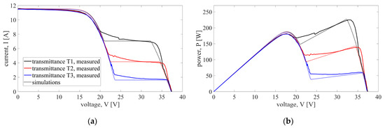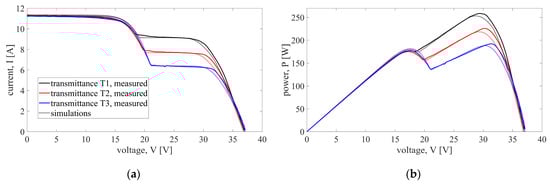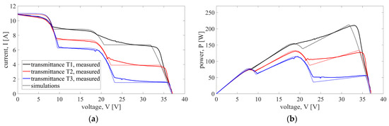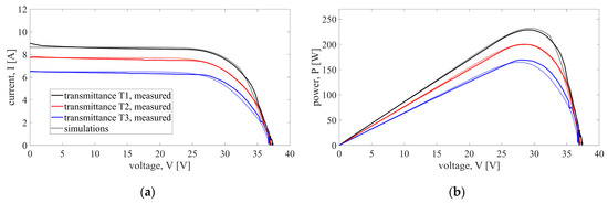 It is well known that the shading of a single solar cell can activate the bypass diode, circumventing the current flow of the whole series substring. Despite that, partial shading of a single substring included four scenarios with 1, 2, 5, and 10 shaded solar cells from the same substring. The experimental results confirmed that increasing the number of shaded cells in the substring makes a marginal impact on the output characteristics. Therefore, the comparison between simulations and measurements is shown in Figure 5 only for scenario S1 with only one shaded solar cell. The characteristics are given for all three shading sheets with transmittances T1–T3. For all three shading levels, two major disagreements can be observed. First, activation of the bypass diode causes abrupt changes in the curves obtained by simulations, while the measurements show that the actual changes are somewhat gradual. This can be seen for voltages around 20 V. Another noticeable difference occurs for voltages above 30 V, where the simulated curves start decreasing before the measured ones. As a result, the simulations underestimate the maximum power, but this underestimation is rather small with a relative error of −2.1% for the sheet with the highest transmittance T1, −3.3% for the sheet with transmittance T2, and −2% for the sheet with transmittance T3. In all other scenarios belonging to this case (S2–S4), the results are even better, with smaller errors. The error metrics show a high level of the model’s accuracy when the agreement along the curves is analyzed. The highest value of nRMSE is 2.1% for the I-V curve (obtained for shading level T1, Scenario 4), while for the P-V curve, the highest nRMSE is 3.5% (shading level T3, Scenario 4). All other errors are typically less than ±2% and are given in Table 2.