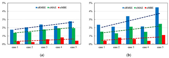 Comparison of error metrics by studied shading cases: (a) error metrics for I-V curves; (b) error metrics for the P-V curves. Dashed lines represent trendlines obtained by linear regression.