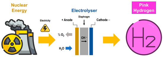 In this context, the need arises to find new, safer, and more sustainable technological solutions that allow nuclear energy to maintain its fundamental role as a source of electricity generation in the current energy transition towards renewable energies [13]. Gen IV nuclear reactors and Small Modular Reactors (SMRs) are among the different technological solutions proposed [14,15,16]. However, a promising new technological solution has emerged in recent years, which would give nuclear energy a fundamental role as a source of electricity generation: pink hydrogen [17].