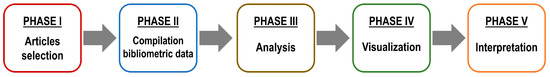 To achieve the research objective, a bibliometric review of scientific publications related to pink hydrogen has been developed. The bibliometric review provides a more comprehensive and objective analysis of the advances in the field accumulated over time [29,30]. As a general work plan (Figure 2), the bibliometric method includes the following phases [31]: Phase I: articles selection; Phase II: compilation of bibliometric data; Phase III: analysis; Phase IV: visualization; Phase IV: interpretation.