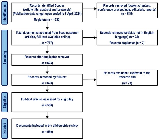 The initial keyword-based search indicated a large number of published articles. To provide greater precision in determining the size of the sample to be analyzed, the PRISMA guidelines [33,34] were used as a reference. According to this PRISMA protocol [35], there are four steps to determine the sample population of a bibliometric review (Figure 3): (i) Identification; (ii) Screening; (iii) Eligibility; (iv) Included.