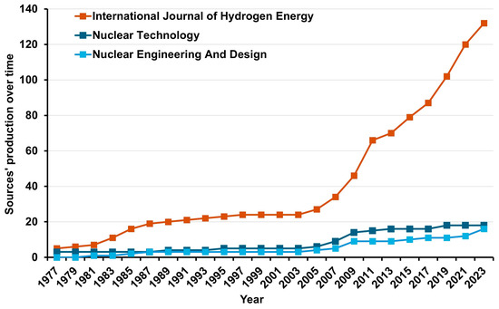 As far as the journals are concerned, of the 205 journals identified, the most influential journal on pink hydrogen is clearly “International Journal of Hydrogen Energy” (H-index of 42), in which more than 25% (146 absolute records) of the records found are published. The rest of the identified journals have a residual influence in terms of published results, being less than 4%. In this group, “Nuclear Technology” (H-index of 9) and “Nuclear Engineering and Design” (H-index of 9) stand out, with an influence slightly higher than 3%. As can be seen in Figure 5, the production of sources has been growing over time. The growth started to increase in the early 2000s, as very few articles were published in this research field before. “International Journal of Hydrogen Energy” confirms its predominant position in this field and shows a substantial increase in articles and publications, indicating a growing interest in this topic. The other two relevant journals, “Nuclear Technology” and “Nuclear Engineering and Design”, have not experienced a significant upward trend.