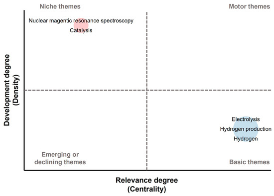To represent the degree of development and importance of current research and to expose the lines of research in trend, a thematic map has been developed (Figure 11). The bubbles represent groups of keywords (themes). Their names are the most relevant keywords based on their co-occurrence. The map shows four quadrants: (i) motor themes (high density and centrality); (ii) basic themes (low density and high centrality); (iii) niche themes (high density and low centrality); (iv) emerging/declining themes (low density and centrality) [46]. In the case of pink hydrogen research, no terms are found in the motor and emerging/declining themes quadrants. In the niche themes quadrant are “nuclear magnetic resonance spectroscopy” and “catalysis”; however, in the basic themes quadrant are the terms “electrolysis”, “hydrogen production”, and “hydrogen”.
