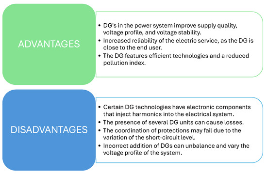 The solution to the dynamic growth of demand and the disturbances that can cause electrical energy losses due to the lack of response of centralized generation is decentralized generation in a determined framework based on planning studies and for strategic sectors. However, the use of DG causes certain inconveniences to the grid due to its insertion. In Figure 2, the advantages and disadvantages of implementing DG are detailed.