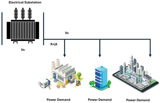 In power flows, the elements of the electrical system are represented by an impedance that directly links a relationship with the voltage at each node or connection point in the network, and the voltage profile varies depending on how far the load node is from the substation depending on the power flow and the impedance of the substation as illustrated in Figure 4.