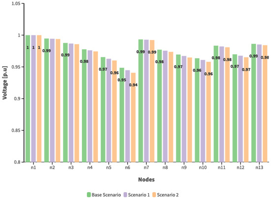 Analyzing Table 10 reveals that the capacity and dispatch of the selected DG depend on the fulfillment of constraints associated with the DG’s network and the minimization of the system’s operating costs. Consequently, in the base scenario and scenario 1, when two and four DG units integrate into the system, their capacity and dispatched power match and approach the maximum value of the DG’s capacity. However, examination of the scenario with six DG units indicates that while a capacity lower than the maximum is determined, the dispatched power is also lower. This adherence to network constraints underscores the distribution system’s ability to supply power to the transmission system. These factors will be evaluated when assessing the electrical variables linked to the substation linking the distribution and transmission systems. Figure 10, Figure 11 and Figure 12 exhibit the voltage module outcomes for each load scenario, considering the location and capacity of the selected DG units and the quantity of incorporated DG units.