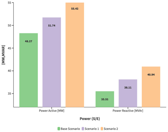 Table 8 presents the voltage quality index, and the highlighted results correspond to the nodes located at the end of each branch of the modeled electrical system, which will serve to evaluate the impact of DG when incorporated into the network. Additionally, Figure 7 illustrates the amount of active and reactive power the system delivers through the substation, with values tabulated according to the demand scenario. An increase in demand leads to an increase in the energy supplied by the system through the interconnection substation.