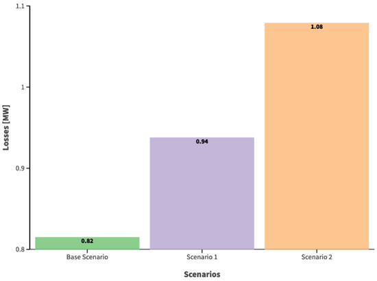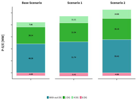 Regarding the assessment of losses, we can observe that when evaluating them without DG in any of the scenarios and cases studied, the average value amounts to 0.9466 MW. However, when we assess an average value of losses in any of the scenarios, including DG, they amount to 0.5388 MW, representing a decrease of 43.07%. Therefore, DG, in addition to providing the benefits mentioned above, also reduces losses in the system due to its bidirectional flow in the networks.