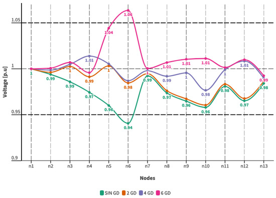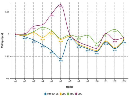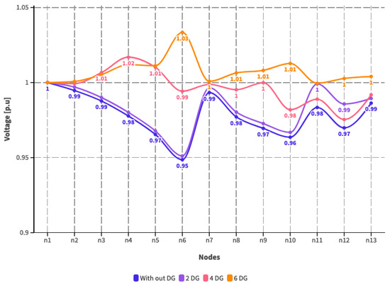 Voltage profile with DG incorporation—Scenario 1.
