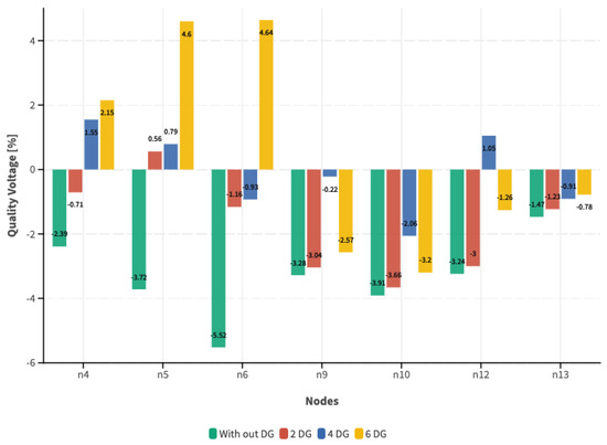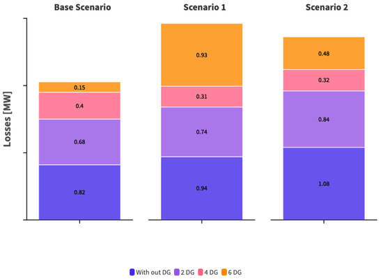 Figure 13, Figure 14 and Figure 15 show that the voltage level quality index initially evaluated in the initial case without DG improves compared to that with the incorporation of DG. It remains within the permitted limits according to Regulation No. ARCONEL 005/18. This is related to the improvement of the voltage profile. In this context, a higher optimal incorporation of DG enhances the quality above the index, resulting in a substantial increase, as demonstrated when six DG units are incorporated into the system regardless of the demand scenario. Corresponding to the analysis of the voltage profile and the voltage level quality index, we analyze the system losses based on the demand scenarios and the quantity of incorporated DG, with the results shown in Figure 16.