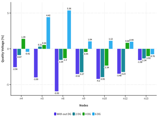 Considering the voltage values obtained, the voltage quality index is calculated for each demand scenario, as shown in Figure 6.