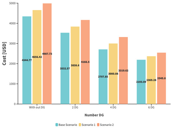 Based on the results, when evaluating the cost without DG in any of the scenarios and cases studied, the average value amounts to USD 4662.97. However, when assessing the average price in any of the scenarios, including DG, it amounts to USD 3074.82, representing a decrease of 34.06%. Therefore, we confirm that the model fulfills the function of minimizing costs.