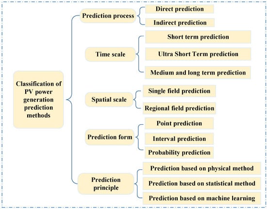 PV output power exhibits obvious non-stationary random characteristics due to the close correlation between PV output and many influencing factors [8]. The fluctuation of PV power significantly reduces the safety and reliability of energy system operation for energy systems containing PV power generation [9,10]. To cope with the uncertainty of PV output, the system needs to reserve a certain amount of spare capacity to maintain power balance and ensure safe and reliable operation of the system. Therefore, accurate prediction of the power output of PV power generation is a key means to effectively dealing with the inherent randomness and instability of PV grid connection [11]. Due to the nonlinearity, indirect volatility, and uncertainty of power output in PV power generation systems, improving the characterization ability of existing models and establishing high-precision PV power prediction models is a major challenge [12,13]. At present, domestic and foreign scholars have conducted extensive and in-depth research on PV power prediction methods. The classification of PV power prediction methods based on different classification criteria is shown in Figure 1 [14,15].