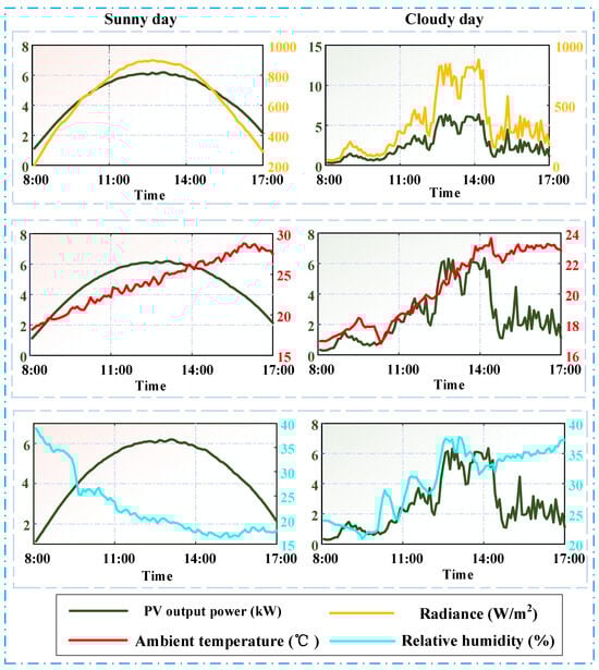 The meteorological indicators studied include radiation intensity, environmental temperature, and relative humidity. The relationship curves between output power and different meteorological indicators on sunny and cloudy days are shown in Figure 3.