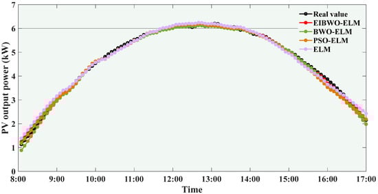 Case 1 is the prediction of PV power generation on sunny days. The EIBWO-ELM, BWO-ELM, PSO-ELM, and ELM prediction models established in this study were used to predict the output power of PV power generation on sunny days. The four prediction models constructed in this study, EIBWO-ELM, BWO-ELM, PSO-ELM, and ELM were used to predict the output power of PV power generation. The actual output power values and the predicted values obtained after model prediction are shown in Figure 5.