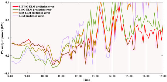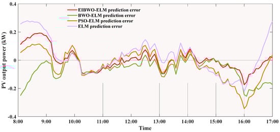 From Figure 9, it can be intuitively seen that the prediction models performed differently at different sample points. During 8:00–10:00, the predicted relative error curve of EIBWO-ELM was closer to 0, which indicates that during this time period, the predicted values of EIBWO-ELM were very close to the actual observed values and the prediction error was smaller. In contrast, the error curves of other models fluctuated significantly, deviating from the straight line with an error of 0. this means that BWO-ELM, PSO-ELM, and ELM had lower accuracy.