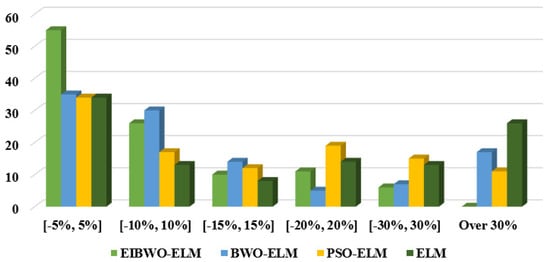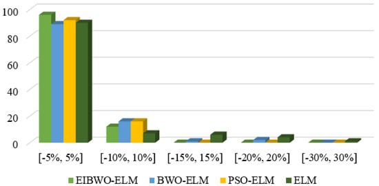From Table 6, it can be seen that on sunny days, the relative error range of all models was between [−30%, 30%]. There were 96 sample points with a relative error range between [−5%, 5%] with EIBWO-ELM, accounting for 88.89% of the total number of samples. However, the relative error range of ELM prediction results was more dispersed, and there was one sample point within the range of [−30%, 30%]. Therefore, on sunny days, the EIBWO-ELM model had the highest number of sample points in the low error range and had good prediction accuracy. The effectiveness of the proposed EIBWO optimization ELM is proven in this study.