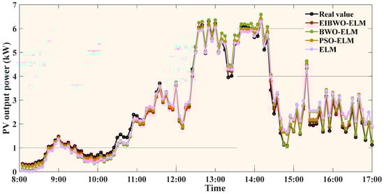 Case 2 is the prediction of PV power generation on cloudy days. EIBWO-ELM, BWO-ELM, PSO-ELM, and ELM were used to predict the output power of PV power generation. The actual output power values and the predicted values obtained after model prediction on cloudy days are shown in Figure 8.